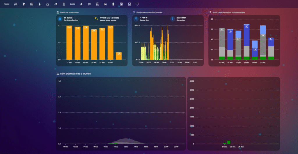 On y retrouve notamment la durée de production solaire, la consommation électrique de la journée, le coût hebdomadaire de la consommation, ainsi que la production d’électricité quotidienne et hebdomadaire.