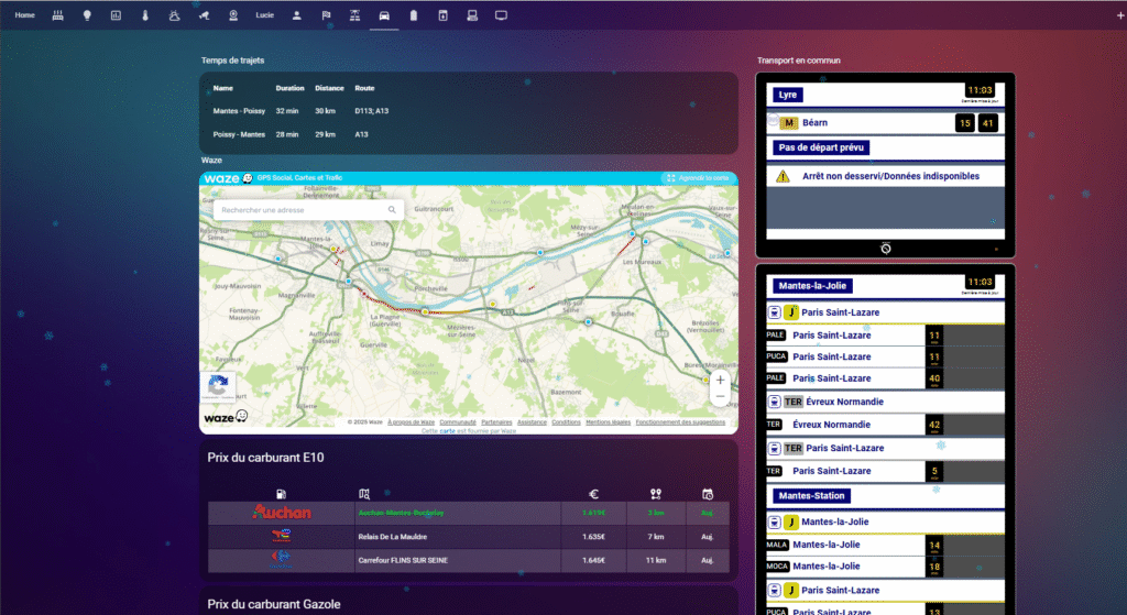 Cette carte regroupe de nombreuses informations utiles au quotidien : les temps de trajet, les prochains bus et trains, le coût des carburants autour de chez moi, ainsi que le suivi de ma voiture.